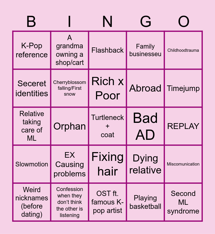 This bingo card has a free space and 38 words: Amnesia, Car crash, Bad english actors, Cherryblossom falling/First snow, Miscomunication, EX Causing problems, Rich x Poor, Secret relationship, Childhoodtrauma, Abroad, Orphan, Family businesseu, Second ML syndrome, REPLAY, Seceret identities, Slowmotion, Webtoon effects, Flashback, Bullying, Bad AD, K-Pop reference, Confession when they don’t think the other is listening, Timejump, Weird nicknames (before dating), Stupid FL, OST ft. famous K-pop artist, Socialmedia scandal, KDrama magic, Blind date, Coma, Arranged marriage, Fixing hair, Playing basketball, A grandma owning a shop/cart, Box folding (Poor people behavior), Dying relative, Relative taking care of ML and Typical FL/ML BFF.