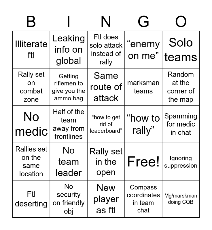 This bingo card has 25 words: No team leader, New player as ftl, Same route of attack, Ftl deserting, Solo teams, Illiterate ftl, Rally set on combat zone, Leaking info on global, “how to rally”, Rally set in the open, marksman teams, No medic, Free!, Ignoring suppression, Getting riflemen to give you the ammo bag, Mg/marskman doing CQB, Spamming for medic in chat, Ftl does solo attack instead of rally, Random at the corner of the map, Half of the team away from frontlines, “how to get rid of leaderboard”, No security on friendly obj, Rallies set on the same location, “enemy on me” and Compass coordinates in team chat.