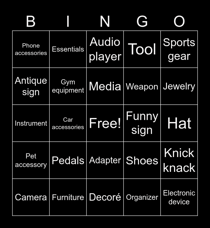 This bingo card has a free space and 24 words: Pedals, Furniture, Media, Camera, Sports gear, Phone accessories, Antique sign, Essentials, Funny sign, Adapter, Weapon, Instrument, Shoes, Knick knack, Gym equipment, Organizer, Hat, Audio player, Jewelry, Car accessories, Electronic device, Pet accessory, Tool and Decoré.