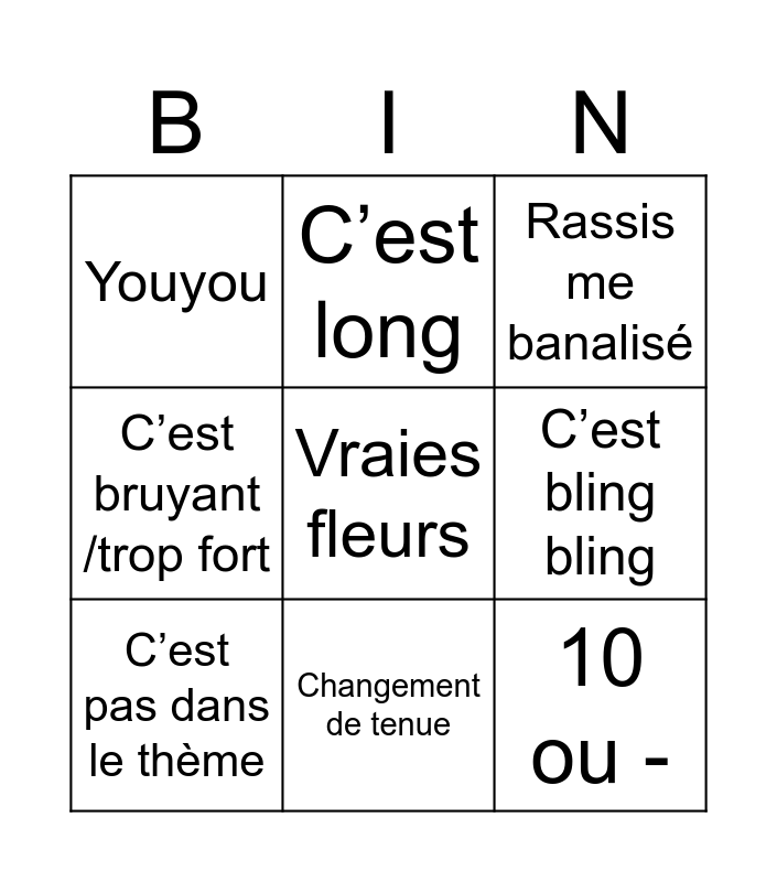 This bingo card has a free space and 8 words: C’est bling bling, Rassis me banalisé, C’est long, C’est pas dans le thème, Youyou, 10 ou -, C’est bruyant /trop fort and Changement de tenue.