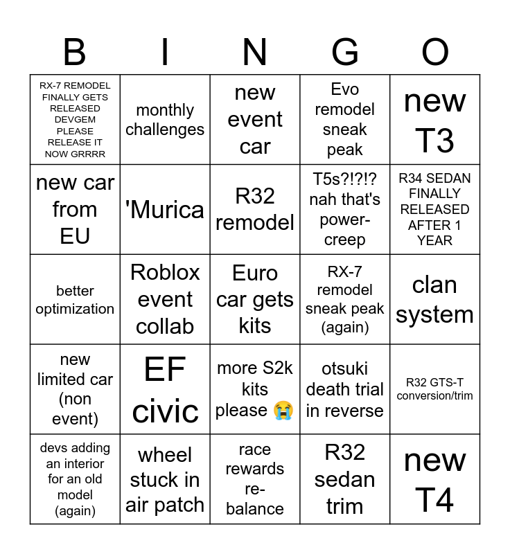 This bingo card has a free space and 24 words: EF civic, wheel stuck in air patch, R32 remodel, devs adding an interior for an old model (again), new T3, RX-7 REMODEL FINALLY GETS RELEASED DEVGEM PLEASE RELEASE IT NOW GRRRR, new car from EU, monthly challenges, RX-7 remodel sneak peak (again), more S2k kits please ðŸ˜, T5s?!?!? nah that's power-creep, better optimization, otsuki death trial in reverse, R32 GTS-T conversion/trim, 'Murica, R32 sedan trim, clan system, new event car, R34 SEDAN FINALLY RELEASED AFTER 1 YEAR, Roblox event collab, new T4, new limited car (non event), Evo remodel sneak peak and race rewards re-balance.