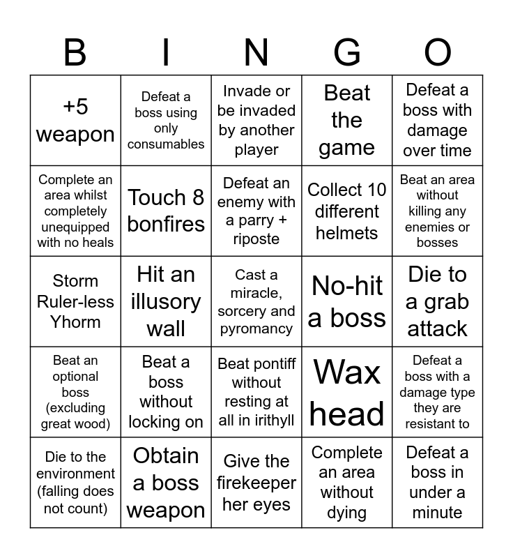 This bingo card has a free space and 24 words: Beat a boss without locking on, Obtain a boss weapon, Defeat an enemy with a parry + riposte, Die to the environment (falling does not count), Defeat a boss with damage over time, +5 weapon, Complete an area whilst completely unequipped with no heals, Defeat a boss using only consumables, No-hit a boss, Beat pontiff without resting at all in irithyll, Collect 10 different helmets, Storm Ruler-less Yhorm, Wax head, Defeat a boss with a damage type they are resistant to, Touch 8 bonfires, Complete an area without dying, Die to a grab attack, Invade or be invaded by another player, Beat an area without killing any enemies or bosses, Hit an illusory wall, Defeat a boss in under a minute, Beat an optional boss (excluding great wood), Beat the game and Give the firekeeper her eyes.