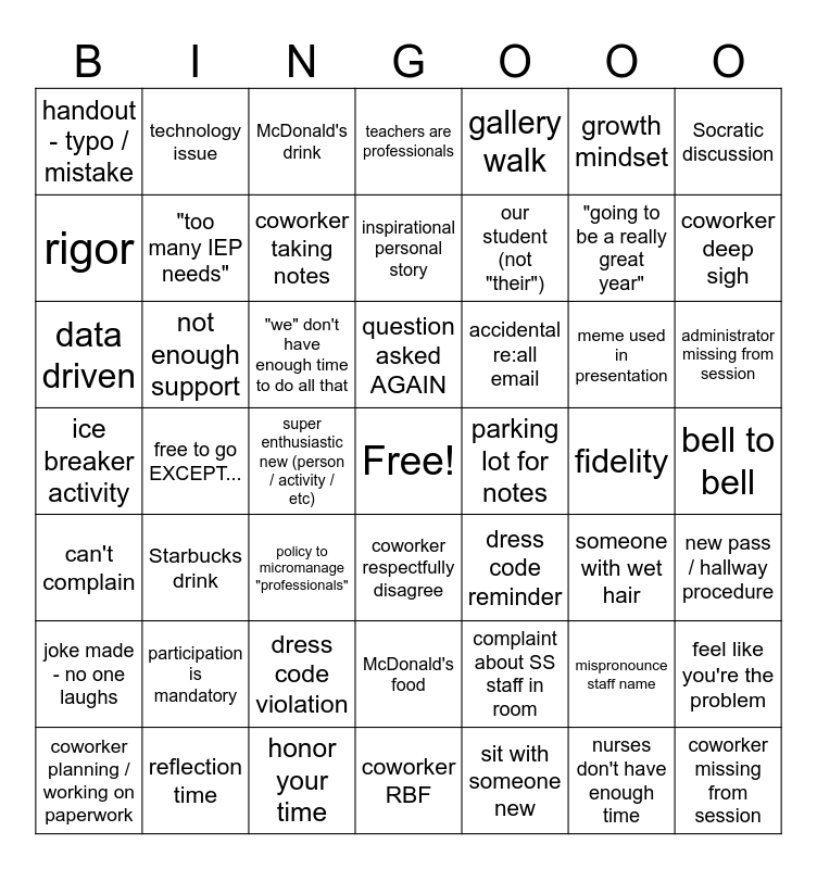 This bingo card has a free space and 65 words: PED has changed policy, can't complain, another day in paradise, meme used in presentation, parking lot for notes, reflection time, technology issue, work through lunch offer, rigor, honor your time, question asked AGAIN, mispronounce staff name, data driven, gallery walk, build relationship, growth mindset, our student (not "their"), handout - typo / mistake, remember your why, "too many IEP needs", "we" don't have enough time to do all that, not enough support, teachers are professionals, policy to micromanage "professionals", cell phone policy change, new pass / hallway procedure, dress code reminder, veteran staff disagreeing with policy, "going to be a really great year", participation is mandatory, administrator missing from session, complaint about SS staff in room, complaint about not enough SS staff in rooms, "unclear" / complaint about / unfair accom / mod, accidental re:all email, ice breaker activity, feel like you're the problem, inspirational personal story, super enthusiastic new (person / activity / etc), joke made - no one laughs, Socratic discussion, fidelity, coworker deep sigh, coworker eye roll, coworker RBF, coworker respectfully disagree, coworker taking notes, coworker planning / working on paperwork, coworker missing from session, bell to bell, sit with someone new, create a name tent, introduce yourself, free to go EXCEPT..., receive a text from an admin, McDonald's bag, McDonald's food, McDonald's drink, Starbucks drink, someone with wet hair, dress code violation, someone arriving late, security has a new concern, nurses don't have enough time and keep kids in class.