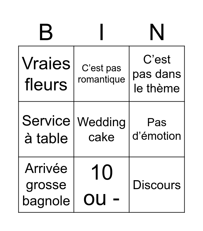 This bingo card has a free space and 8 words: Pas d’émotion, C’est pas dans le thème, C’est pas romantique, Arrivée grosse bagnole, Vraies fleurs, Discours, Service à table and 10 ou -.