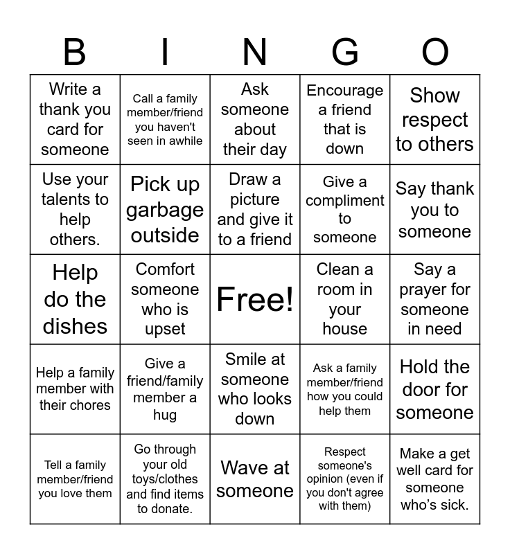 This bingo card has a free space and 24 words: Give a friend/family member a hug, Go through your old toys/clothes and find items to donate., Draw a picture and give it to a friend, Tell a family member/friend you love them, Show respect to others, Write a thank you card for someone, Use your talents to help others., Call a family member/friend you haven't seen in awhile, Clean a room in your house, Smile at someone who looks down, Give a compliment to someone, Help do the dishes, Ask a family member/friend how you could help them, Hold the door for someone, Pick up garbage outside, Respect someone's opinion (even if you don't agree with them), Say a prayer for someone in need, Ask someone about their day, Say thank you to someone, Comfort someone who is upset, Make a get well card for someone who’s sick., Help a family member with their chores, Encourage a friend that is down and Wave at someone.