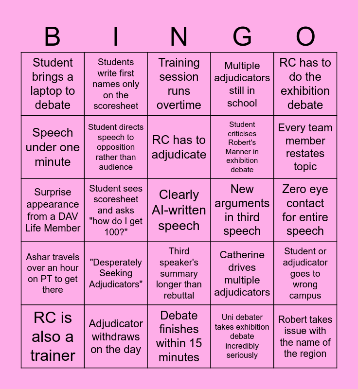 This bingo card has a free space and 24 words: "Desperately Seeking Adjudicators", Adjudicator withdraws on the day, RC has to adjudicate, RC is also a trainer, RC has to do the exhibition debate, Student brings a laptop to debate, Speech under one minute, Students write first names only on the scoresheet, New arguments in third speech, Third speaker's summary longer than rebuttal, Student criticises Robert's Manner in exhibition debate, Surprise appearance from a DAV Life Member, Catherine drives multiple adjudicators, Student or adjudicator goes to wrong campus, Student directs speech to opposition rather than audience, Uni debater takes exhibition debate incredibly seriously, Zero eye contact for entire speech, Training session runs overtime, Every team member restates topic, Student sees scoresheet and asks "how do I get 100?", Robert takes issue with the name of the region, Ashar travels over an hour on PT to get there, Multiple adjudicators still in school and Debate finishes within 15 minutes.