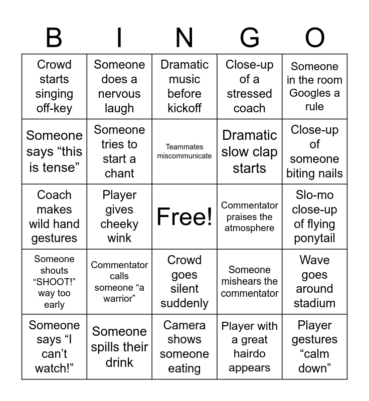 This bingo card has a free space and 60 words: Commentator says “you couldn’t write this!”, Someone spills their drink, Player does a dramatic dive, Someone shouts “SHOOT!” way too early, Player with a great hairdo appears, Commentator mentions a player’s childhood, Someone tries to start a chant, A fan seen crying, Dramatic slow clap starts, Ref gets booed, Close-up of a stressed coach, Ball goes into the crowd, Someone says “this is tense”, Player celebrates too early, “She’s given everything!” said in commentary, Crowd starts singing off-key, Player gestures “calm down”, Someone in the room Googles a rule, Unexpected stat appears on screen, Teammates miscommunicate, Commentator praises the atmosphere, Dramatic music before kickoff, Someone says “I can’t watch!”, Wave goes around stadium, Mascot appears on screen, Camera zooms in on face paint, Player adjusts ponytail or bun, Ref makes a weird hand gesture, Close-up of someone biting nails, Camera shows a royal or celeb, Commentator says “this is what it's all about”, Someone says “this reminds me of…”, Dance music plays during break, Fan holds up funny sign, Someone does a nervous laugh, Group selfie in the room, Ref looks completely unfazed, Player gives cheeky wink, Commentator overuses the word “momentum”, Coach makes wild hand gestures, Player looks confused after whistle, Commentator calls someone “a warrior”, Slo-mo close-up of flying ponytail, Silly shot from the spidercam, Someone mishears the commentator, Player laughs after missed chance, Camera shows a bored kid in crowd, Someone says “we’ve got this” too confidently, Commentator says “nerves are showing”, Crowd goes silent suddenly, Camera shows someone eating, Awkward high-five in your group, Player kicks nothing but air, Someone claims they predicted that, Confetti or streamers on pitch, “That should be a red!” is shouted, Fan holding country flag as cape, Player gets ball stuck under feet, Ref drops something and Someone says, “I’d have scored that”.