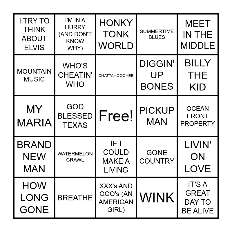 This bingo card has a free space and 50 words: DEEPER THAN THE HOLLER, IT'S A GREAT DAY TO BE ALIVE, SHE'S IN LOVE WITH THE BOY, XXX's AND OOO's (AN AMERICAN GIRL), WATERMELON CRAWL, SONG OF THE SOUTH, I'M IN A HURRY (AND DON'T KNOW WHY), ROLL ON (EIGHTEEN WHEELER), MOUNTAIN MUSIC, LITTLE BITTY, WHO'S CHEATIN' WHO, SUMMERTIME BLUES, LIVIN' ON LOVE, GONE COUNTRY, DON'T ROCK THE JUKEBOX, CHASIN' THAT NEON RAINBOW, CHATTAHOOCHEE, PICKUP MAN, JOHN DEERE GREEN, MEET IN THE MIDDLE, GOD BLESSED TEXAS, WINK, I TRY TO THINK ABOUT ELVIS, DIGGIN' UP BONES, FOREVER AND EVER, AMEN, WHEN YOU SAY NOTHING AT ALL, BILLY THE KID, CADILLAC RANCH, HONKY TONK WORLD, IF I COULD MAKE A LIVING, ONE BOY, ONE GIRL, THAT'S MY STORY, STRAWBERRY WINE, A THOUSAND MILES FROM NOWHERE, BREATHE, THE WAY YOU LOVE ME, THIS KISS, TAKE ME AS I AM, ALL MY EX'S LIVE IN TEXAS, OCEAN FRONT PROPERTY, AMARILLO BY MORNING, CHECK YES OR NO, HEARTLAND, LOVE WITHOUT END, AMEN, HOW LONG GONE, MY MARIA, SHE'S NOT THE CHEATIN' KIND, ROCK MY WORLD (LITTLE COUNTRY GIRL), BRAND NEW MAN and NEON MOON.