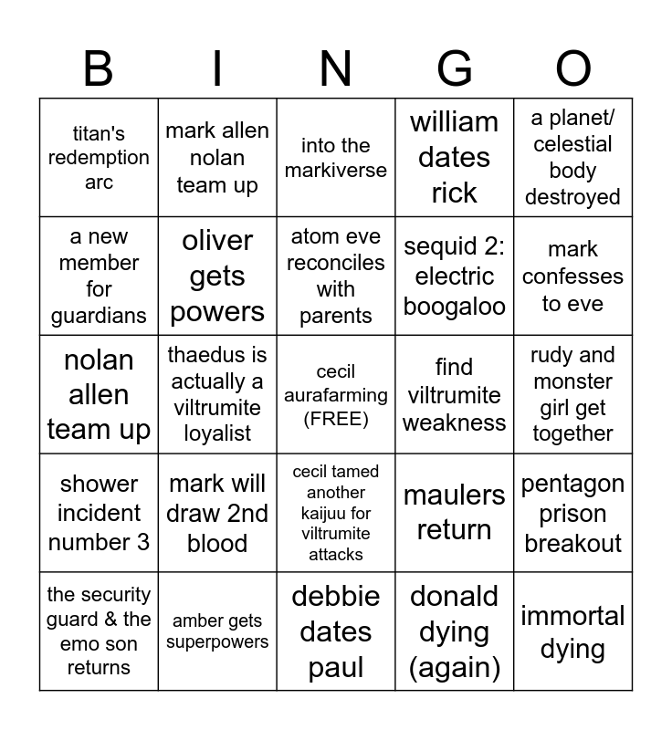 This bingo card has a free space and 24 words: mark will draw 2nd blood, amber gets superpowers, atom eve reconciles with parents, the security guard & the emo son returns, a planet/ celestial body destroyed, titan's redemption arc, a new member for guardians, mark allen nolan team up, find viltrumite weakness, cecil tamed another kaijuu for viltrumite attacks, sequid 2: electric boogaloo, nolan allen team up, maulers return, pentagon prison breakout, oliver gets powers, donald dying (again), rudy and monster girl get together, into the markiverse, mark confesses to eve, thaedus is actually a viltrumite loyalist, immortal dying, shower incident number 3, william dates rick and debbie dates paul.