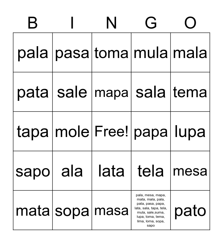 This bingo card has a free space and 25 words: ala, masa, mapa, mata, mala, pala, pata, pasa, papa, lata, sala, tapa, tela, mesa, sale, suma, lupa, toma, tema, mole, pato, sopa, sapo, mula and pala, mesa, mapa, mata, mala, pala, pata, pasa, papa, lata, sala, tapa, tela, mula, sale,suma, lupa, toma, tema, lima, loma, sopa, sapo.