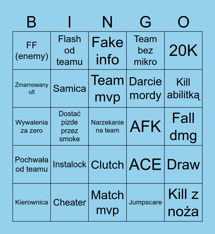 This bingo card has 25 words: Instalock, Match mvp, Team mvp, Kierownica, 20K, FF (enemy), Zmarnowany ult, Flash od teamu, AFK, Clutch, Darcie mordy, Wywalenia za zero, ACE, Draw, Samica, Kill z noża, Fall dmg, Fake info, Kill abilitką, Dostać pizde przez smoke, Narzekanie na team, Cheater, Pochwała od teamu, Team bez mikro and Jumpscare.