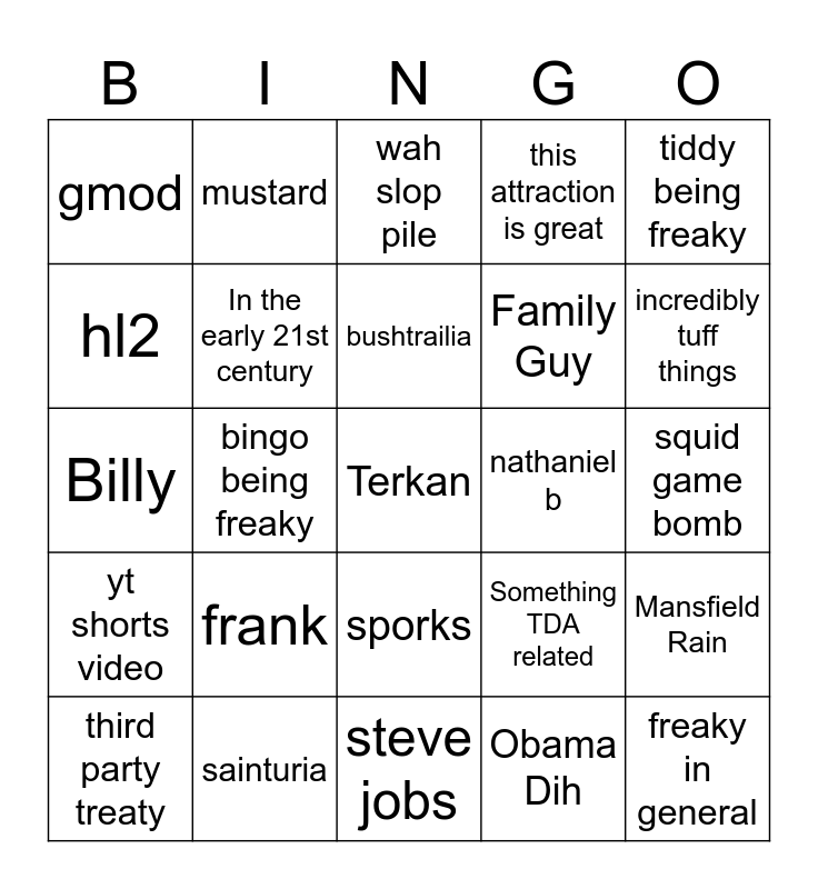 This bingo card has a free space and 24 words: frank, sainturia, bushtrailia, third party treaty, tiddy being freaky, gmod, hl2, mustard, nathaniel b, sporks, Family Guy, Billy, Something TDA related, Mansfield Rain, In the early 21st century, Obama Dih, squid game bomb, wah slop pile, incredibly tuff things, bingo being freaky, freaky in general, yt shorts video, this attraction is great and steve jobs.