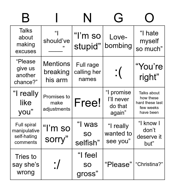 This bingo card has a free space and 24 words: “I’m so sorry”, :/, Full rage calling her names, Tries to say she’s wrong, “I hate myself so much”, Talks about making excuses, “Please give us another chance?”, “I should’ve ____”, “I promise I’ll never do that again”, “I was so selfish”, :(, “I really like you”, “I really wanted to see you”, “I know I don’t deserve it but”, Mentions breaking his arm, “Please”, Talks about how these hard these last few weeks have been, “I’m so stupid”, “You’re right”, Promises to make adjustments, “Christina?”, Full spiral manipulative self-hating comments, Love-bombing and “I feel so gross”.