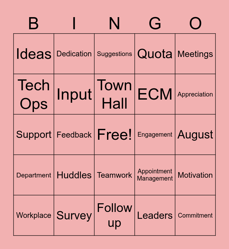 This bingo card has a free space and 30 words: Survey, Results, Feedback, Participation, Ideas, Suggestions, Input, Teamwork, Engagement, Follow up, August, Commitment, Leaders, Frontline, Appreciation, Valued, Appointment Management, Department, Huddles, Meetings, Support, Efforts, Dedication, ECM, Tech Ops, Quota, Motivation, Workplace, Town Hall and Updates.