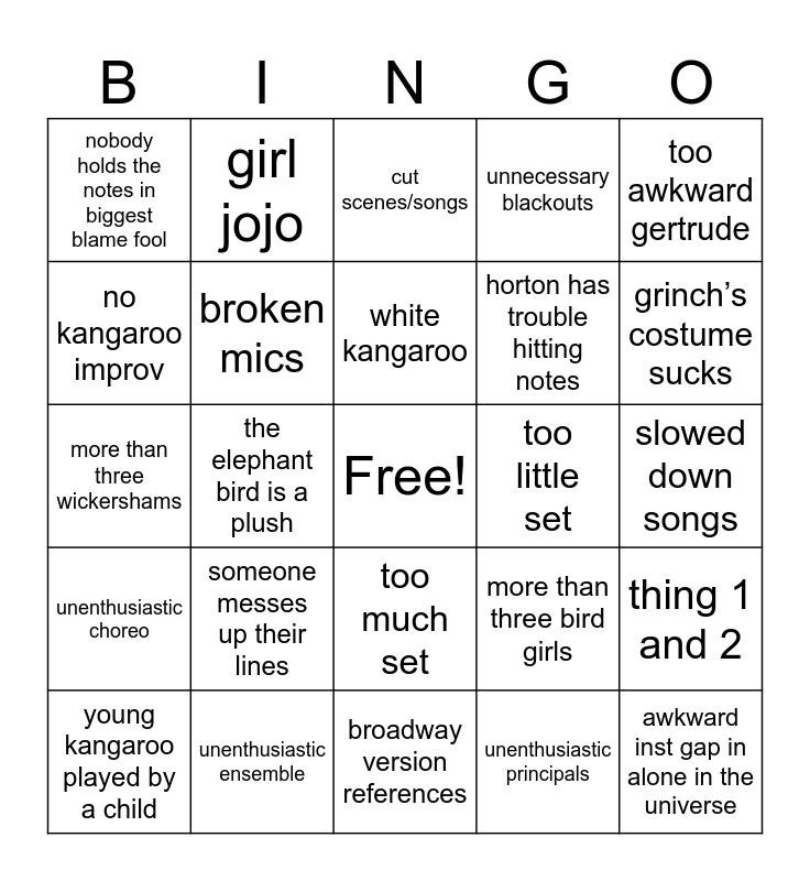 This bingo card has a free space and 24 words: someone messes up their lines, unenthusiastic ensemble, white kangaroo, young kangaroo played by a child, too awkward gertrude, nobody holds the notes in biggest blame fool, no kangaroo improv, girl jojo, too little set, too much set, horton has trouble hitting notes, more than three wickershams, more than three bird girls, thing 1 and 2, broken mics, unenthusiastic principals, slowed down songs, cut scenes/songs, grinch’s costume sucks, the elephant bird is a plush, awkward inst gap in alone in the universe, unenthusiastic choreo, unnecessary blackouts and broadway version references.