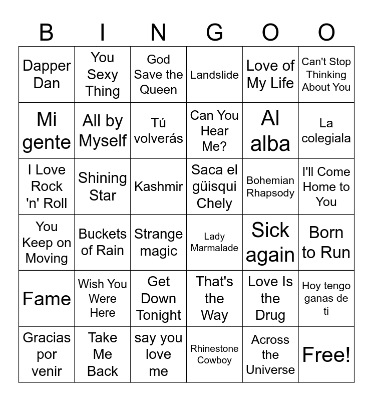 This bingo card has 42 words: Across the Universe, All by Myself, Baby, I Love Your Way, Bohemian Rhapsody, Born to Run, Buckets of Rain, I Love Rock 'n' Roll, Jive Talkin', God Save the Queen, I'll Come Home to You, Kashmir, Can You Hear Me?, La colegiala, Love of My Life, Take Me Back, You Keep on Moving, Hoy tengo ganas de ti, Al alba, Free!, You Sexy Thing, Can't Stop Thinking About You, Get Down Tonight, Fame, Dapper Dan, Golden Years, Gracias por venir, Tú volverás, Rock and Roll All Nite, Wish You Were Here, Love Is the Drug, One of These Nights, Saca el güisqui Chely, Mi gente, Sick again, say you love me, Strange magic, Lady Marmalade, Shining Star, That's the Way, Rhinestone Cowboy, Landslide and Tangled Up in Blue.