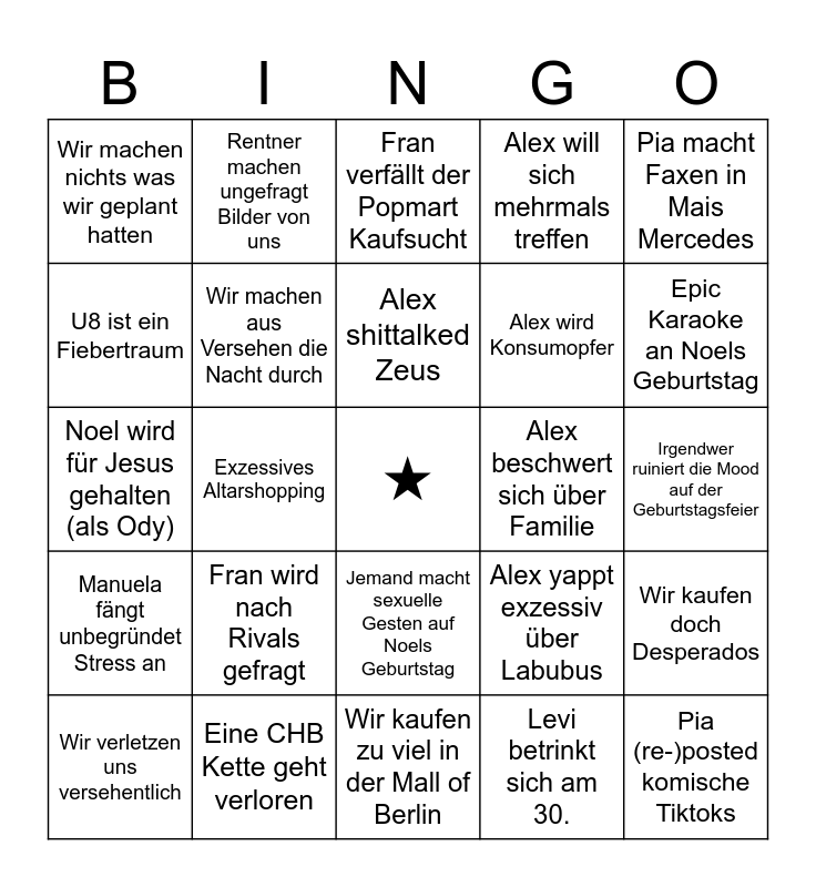 This bingo card has a free space and 24 words: Fran wird nach Rivals gefragt, Eine CHB Kette geht verloren, Alex shittalked Zeus, Wir verletzen uns versehentlich, Pia macht Faxen in Mais Mercedes, Wir machen nichts was wir geplant hatten, U8 ist ein Fiebertraum, Rentner machen ungefragt Bilder von uns, Alex beschwert sich über Familie, Jemand macht sexuelle Gesten auf Noels Geburtstag, Alex wird Konsumopfer, Noel wird für Jesus gehalten (als Ody), Alex yappt exzessiv über Labubus, Wir kaufen doch Desperados, Wir machen aus Versehen die Nacht durch, Levi betrinkt sich am 30., Irgendwer ruiniert die Mood auf der Geburtstagsfeier, Fran verfällt der Popmart Kaufsucht, Epic Karaoke an Noels Geburtstag, Exzessives Altarshopping, Pia (re-)posted komische Tiktoks, Manuela fängt unbegründet Stress an, Alex will sich mehrmals treffen and Wir kaufen zu viel in der Mall of Berlin.