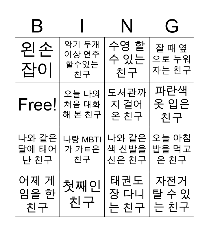 This bingo card has 16 words: 첫째인 친구, 오늘 아침밥을 먹고 온 친구, 수영 할 수 있는 친구, 왼손 잡이, 나와 같은 달에 태어 난 친구, 악기 두개 이상 연주할수있는 친구, 나와 같은 색 신발을 신은 친구, 태권도장 다니는 친구, Free!, 오늘 나와 처음 대화 해 본 친구, 어제 게임을 한 친구, 잘 때 옆으로 누워자는 친구, 나랑 MBTI가 같은 친구, 파란색 옷 입은 친구, 도서관까지 걸어 온 친구 and 자전거 탈 수 있는 친구.