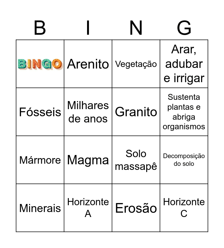 This bingo card has 1 images and 15 words: Horizonte A, Decomposição do solo, Vegetação, Mármore, Arenito, Solo massapê, Erosão, Fósseis, Milhares de anos, Minerais, Arar, adubar e irrigar, Magma, Sustenta plantas e abriga organismos, Granito and Horizonte C.