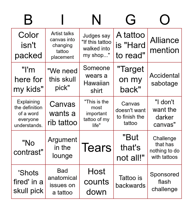 This bingo card has 25 words: Argument in the lounge, Host counts down, Someone wears a Hawaiian shirt, 'Shots fired' in a skull pick, Alliance mention, Color isn't packed, "I'm here for my kids", Artist talks canvas into changing tattoo placement, Canvas doesn't want to finish the tattoo, Tears, "Target on my back", Explaining the definition of a word everyone understands., "But that's not all!", Challenge that has nothing to do with tattoos, "We need this skull pick", Sponsored flash challenge, "I don't want the darker canvas", Judges say "If this tattoo walked into my shop...", Accidental sabotage, Canvas wants a rib tattoo, "This is the most important tattoo of my life", Bad anatomical issues on a tattoo, "No contrast", A tattoo is "Hard to read" and Tattoo is backwards.