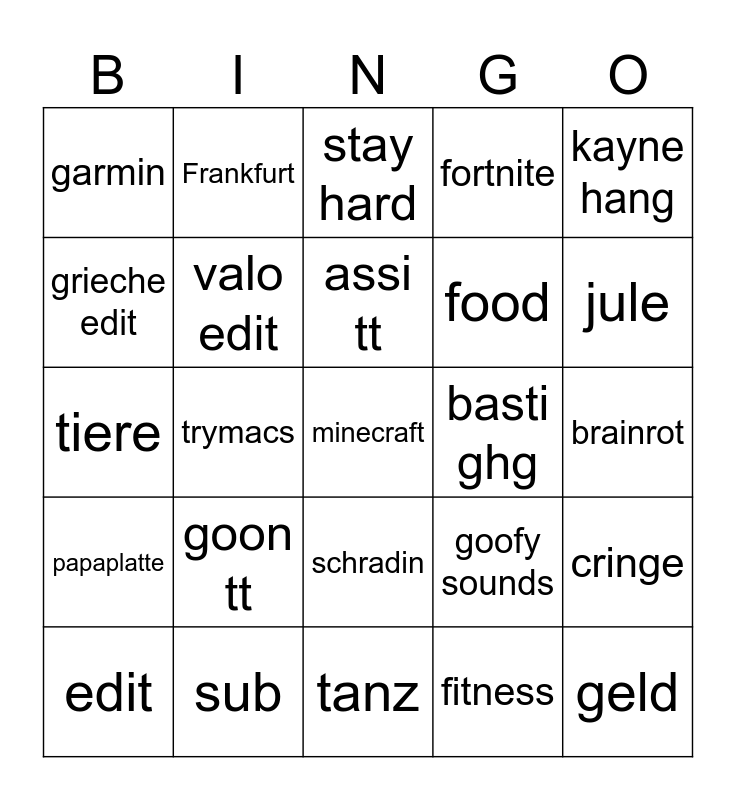 This bingo card has a free space and 24 words: goon tt, sub, assi tt, edit, kayne hang, garmin, grieche edit, Frankfurt, basti ghg, schradin, food, tiere, goofy sounds, cringe, valo edit, fitness, brainrot, stay hard, jule, trymacs, geld, papaplatte, fortnite and tanz.