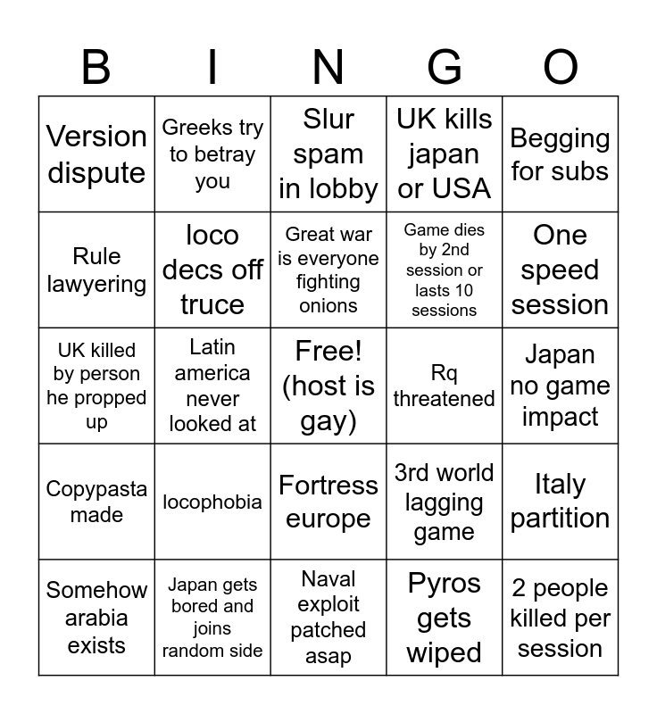 This bingo card has a free space and 24 words: locophobia, Japan gets bored and joins random side, Great war is everyone fighting onions, Somehow arabia exists, Begging for subs, Version dispute, Rule lawyering, Greeks try to betray you, Rq threatened, Fortress europe, Game dies by 2nd session or lasts 10 sessions, UK killed by person he propped up, 3rd world lagging game, Italy partition, loco decs off truce, Pyros gets wiped, Japan no game impact, Slur spam in lobby, One speed session, Latin america never looked at, 2 people killed per session, Copypasta made, UK kills japan or USA and Naval exploit patched asap.