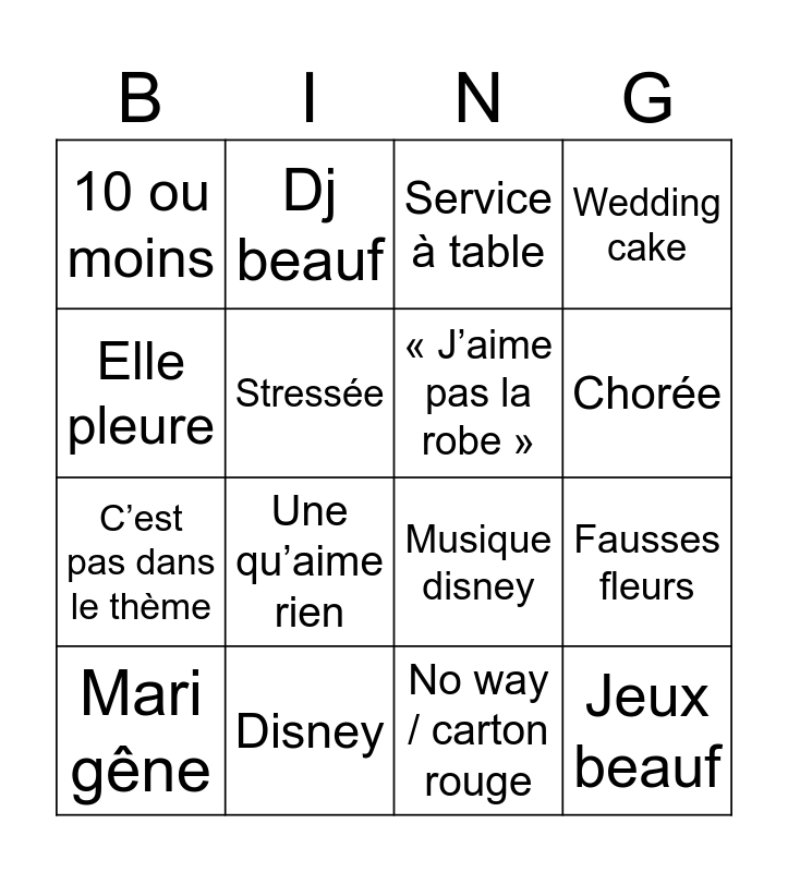 This bingo card has 16 words: Disney, Fausses fleurs, Service à table, 10 ou moins, C’est pas dans le thème, Dj beauf, Musique disney, No way / carton rouge, Elle pleure, Stressée, Mari gêne, Wedding cake, Une qu’aime rien, Chorée, « J’aime pas la robe » and Jeux beauf.