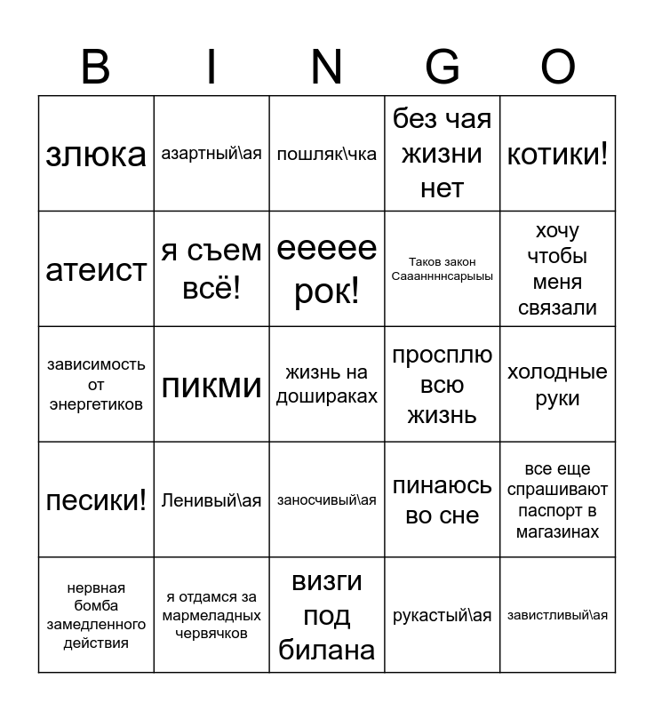 This bingo card has a free space and 24 words: Ленивый\ая, я отдамся за мармеладных червячков, еееее рок!, нервная бомба замедленного действия, котики!, злюка, атеист, азартный\ая, просплю всю жизнь, заносчивый\ая, Таков закон Саааннннсарыыы, зависимость от энергетиков, пинаюсь во сне, все еще спрашивают паспорт в магазинах, я съем всё!, рукастый\ая, холодные руки, пошляк\чка, хочу чтобы меня связали, пикми, завистливый\ая, песики!, без чая жизни нет and визги под билана.