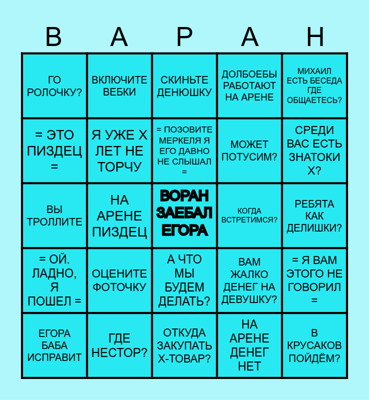 This bingo card has a free space and 24 words: ОЦЕНИТЕ ФОТОЧКУ, ГДЕ НЕСТОР?, = ПОЗОВИТЕ МЕРКЕЛЯ Я ЕГО ДАВНО НЕ СЛЫШАЛ =, ЕГОРА БАБА ИСПРАВИТ, МИХАИЛ ЕСТЬ БЕСЕДА ГДЕ ОБЩАЕТЕСЬ?, ГО РОЛОЧКУ?, = ЭТО ПИЗДЕЦ =, ВКЛЮЧИТЕ ВЕБКИ, КОГДА ВСТРЕТИМСЯ?, А ЧТО МЫ БУДЕМ ДЕЛАТЬ?, МОЖЕТ ПОТУСИМ?, ВЫ ТРОЛЛИТЕ, ВАМ ЖАЛКО ДЕНЕГ НА ДЕВУШКУ?, = Я ВАМ ЭТОГО НЕ ГОВОРИЛ =, Я УЖЕ Х ЛЕТ НЕ ТОРЧУ, НА АРЕНЕ ДЕНЕГ НЕТ, РЕБЯТА КАК ДЕЛИШКИ?, СКИНЬТЕ ДЕНЮШКУ, СРЕДИ ВАС ЕСТЬ ЗНАТОКИ Х?, НА АРЕНЕ ПИЗДЕЦ, В КРУСАКОВ ПОЙДЁМ?, = ОЙ. ЛАДНО, Я ПОШЕЛ =, ДОЛБОЕБЫ РАБОТАЮТ НА АРЕНЕ and ОТКУДА ЗАКУПАТЬ Х-ТОВАР?.