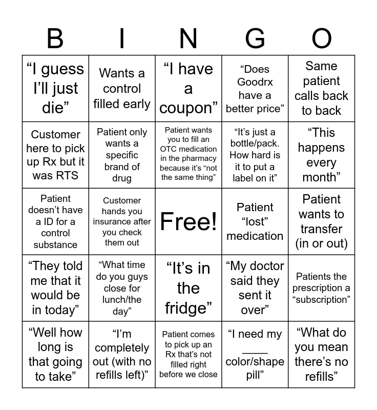 This bingo card has a free space and 73 words: “It was supposed to be done yesterday”, “Just fill everything that can be filled”, “I guess I’ll just die”, Patient wants to pay cash for a control, “I only paid $____ amount last time”, “Can you ring these couple items up for me”, “They told me that it would be in today”, Patient pronounces a medication completely wrong, “My doctor said they sent it over”, Patient wants to talk to the pharmacist, “They said they did the PA already”, “Do I have to wait in line again”, Patient only wants a specific brand of drug, Patient wants to transfer (in or out), “I got a message/call saying it was ready!”, Wants a control filled early, Patient comes to pick up an Rx that’s not filled right before we close, Customer here to pick up Rx but it was RTS, “I’m calling to see if my Rx is ready”, Patient “lost” medication, Patient wants you to fill an OTC medication in the pharmacy because it’s “not the same thing”, “Does Goodrx have a better price”, Same patient calls back to back, Patient walks up to pickup window that nobody is at, “Well how long is that going to take”, Patient wants us to call the insurance, Patient says something about there being no line, Patient doesn’t know the DOB for who they are picking up for, Patient wants us to call the doctor, Patient tries to fill a expired Rx, “I’m completely out (with no refills left)”, “I just took my last one”, “What is/why do I need a PA”, “I didn’t know you guys closed at ___”, Customer hands you insurance after you check them out, “Can you give me some to hold me over”, Customer is on phone the whole time they are at being waited on, “Why doesn’t my insurance cover it”, “What do you mean there’s no refills”, Too soon to refill a medication but the patient is “out of meds “, “I need my ____ color/shape pill”, “What time do you guys close for lunch/the day”, “It didn’t cost this much last time”, “I’m going out of town/on vacation”, “You guys called me about something (they have no clue what it was about)”, “It’s just a bottle/pack. How hard is it to put a label on it”, “I have a coupon”, Patient gives you a coupon after you check them out, “I get stuff here all of the time”, Patient doesn’t have a ID for a control substance, Patient doesn’t have insurance card on them but claims they have insurance, “I always have an issue/problem when I come here”, Customer hands you a non-pharmacy insurance card, Patient doesn’t know what the medication is/what’s it’s used for, Patient wants us to call for an override on their medication, Patient doesn’t know who/where their doctor is, Tells us they want a 90d supply when 30d is the only thing covered by insurance, “It’s in the fridge”, Patients control medication is out of stock, Patient mentions another pharmacy (CVS, Walgreens, Wboro Apothecary, etc.), Patient is mad because we have to call dr to clarify an Rx, Doctor sends over incorrect amount/day supply of medication, Patient shows up after we are closed and asks if they can still get their medication, “This happens every month”, “My insurance hasn’t changed”, Customer wants to transfer a C2, Customer wants to know if we have a C2 in stock without having a script with us, “You guys are busy today aren’t you”, Patients the prescription a “subscription”, Customer wants to return a medication, Patient stands in line just to ask where something is in store, “Why do you need my ID” and “You didn’t ask for my ID last time”.