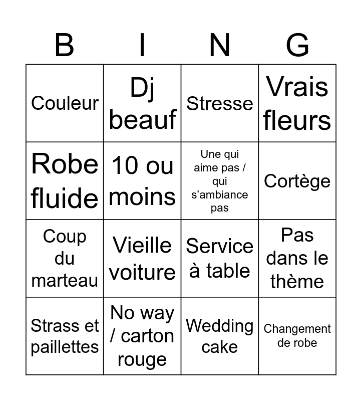This bingo card has 16 words: No way / carton rouge, Pas dans le thème, Stresse, Couleur, Coup du marteau, Dj beauf, Service à table, Wedding cake, Robe fluide, 10 ou moins, Strass et paillettes, Vrais fleurs, Vieille voiture, Cortège, Une qui aime pas / qui s’ambiance pas and Changement de robe.
