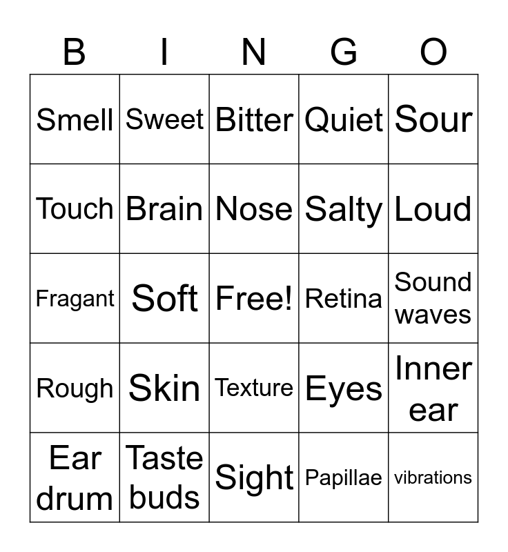 This bingo card has a free space and 24 words: Skin, Taste buds, Nose, Ear drum, Sour, Smell, Touch, Sweet, Retina, Texture, Salty, Fragant, Eyes, Inner ear, Brain, Papillae, Sound waves, Bitter, Loud, Soft, vibrations, Rough, Quiet and Sight.