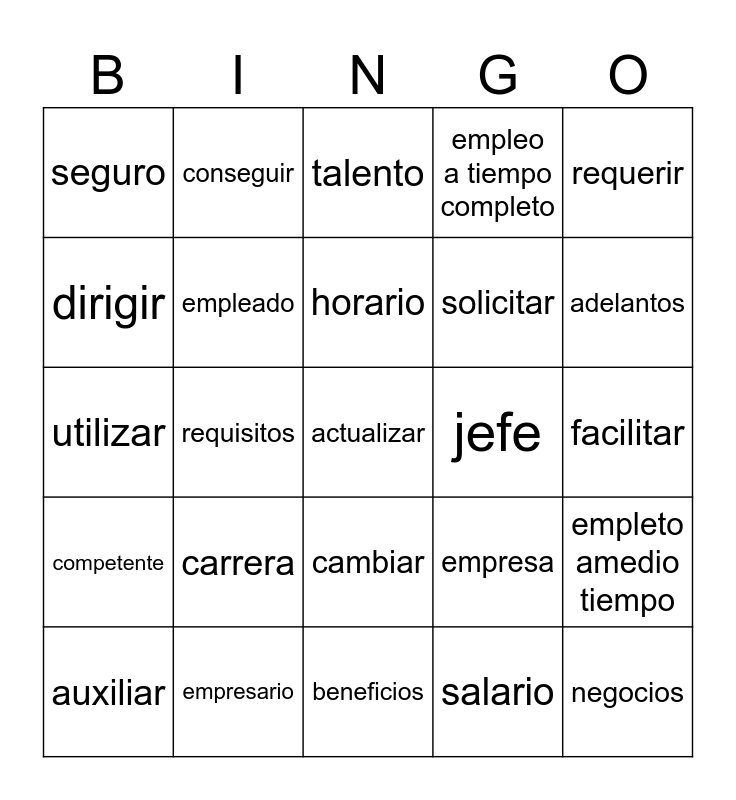 This bingo card has 48 words: Free!, actualizar, ambiente de trabajo, beneficios, carrera, compañeros de trabajo, conseguir, curriculum, dirigir, donar, empleado, empleo a tiempo completo, empleto amedio tiempo, empresa, entrevista, gerente, horario, jefe, puesto, requerir, requisitos, salario, seguro, solicitar, supervisar, adelantos, auxiliar, administrativo, cambiar, competente, decidirse a, desventaja, difícil, emporear, empresario, enseguida, fácil, facilitar, fotocopiadora, inmediatamente, mejorar, negocios, talento, tecnologia, utilizar, ventaja, vida diaria and voluntario.