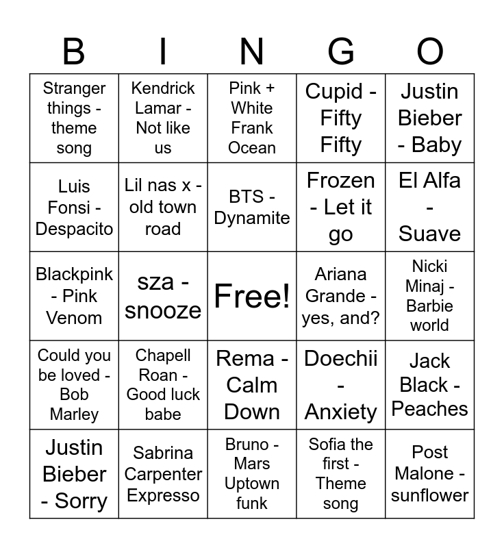 This bingo card has a free space and 30 words: Sabrina Carpenter Expresso, Lil Durk -All my life, sza - snooze, Demon slayer - Theme song, Stranger things - theme song, Pink + White Frank Ocean, Lil nas x - old town road, Rema - Calm Down, Ariana Grande - yes, and?, Bruno - Mars Uptown funk, Nicki Minaj - Barbie world, Post Malone - sunflower, Sofia the first - Theme song, The Kid LAROI, JB - Stay, El Alfa - Suave, Billie Eilish - Birds of a feather, Doechii - Anxiety, Could you be loved - Bob Marley, Chapell Roan - Good luck babe, Justin Bieber - Baby, Blackpink - Pink Venom, Megan the stallion - Mamushi, Kendrick Lamar - Not like us, Frozen - Let it go, Luis Fonsi -Despacito, Cupid - Fifty Fifty, Jack Black - Peaches, Justin Bieber - Sorry, BTS - Dynamite and Central Cee & Lil Baby - BAND4BAND.