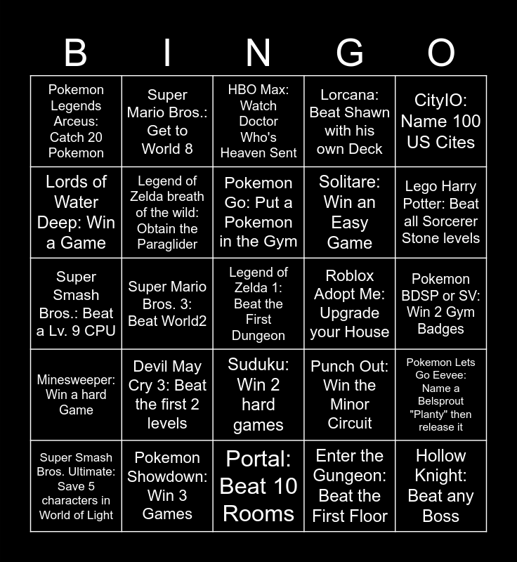 This bingo card has 31 words: Portal: Beat 10 Rooms, Clash Royal: Win 10 Games, Super Mario Bros. 3: Beat World2, Portal 2: Get to Chapter 4, Pokemon Legends Arceus: Catch 20 Pokemon, HBO Max: Watch Doctor Who's Heaven Sent, Legend of Zelda breath of the wild: Obtain the Paraglider, Punch Out: Win the Minor Circuit, Roblox Adopt Me: Upgrade your House, Enter the Gungeon: Beat the First Floor, Pokemon BDSP or SV: Win 2 Gym Badges, Legend of Zelda 1: Beat the First Dungeon, Hollow Knight: Beat any Boss, Mario Kart 8: Win a Gold Trophy on 150cc or higher, Lego Harry Potter: Beat all Sorcerer Stone levels, Among Us: Win a Game, Pokemon Lets Go Eevee: Name a Belsprout "Planty" then release it, Devil May Cry 3: Beat the first 2 levels, Minesweeper: Win a hard Game, Suduku: Win 2 hard games, CityIO: Name 100 US Cites, Pokerouge: Get a Pokemon to Lv. 100, Super Smash Bros. Ultimate: Save 5 characters in World of Light, Super Mario Bros.: Get to World 8, Solitare: Win an Easy Game, Lords of Water Deep: Win a Game, Lorcana: Beat Shawn with his own Deck, Super Smash Bros.: Beat a Lv. 9 CPU, Pokemon Showdown: Win 3 Games, Pokemon Go: Put a Pokemon in the Gym and Ticket to Ride: Win a Game on the Europe Map.