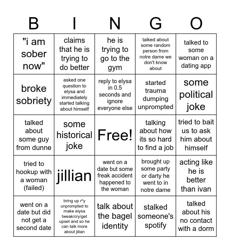 This bingo card has a free space and 24 words: jillian, bring up r*y unprompted to make elysa tweak/cry/get upset and so he can talk more about jilian, reply to elysa in 0.5 seconds and ignore everyone else, went on a date but did not get a second date, talked to some woman on a dating app, "i am sober now", broke sobriety, claims that he is trying to do better, talking about how its so hard to find a job, went on a date but some freak accident happened to the woman, started trauma dumping unprompted, talked about some guy from dunne, brought up some party or darty he went to in notre dame, acting like he is better than ivan, asked one question to elysa and immediately started talking about himself, stalked someone's spotify, tried to bait us to ask him about himself, he is trying to go to the gym, some political joke, some historical joke, talked about his no contact with a dorm, tried to hookup with a woman (failed), talked about some random person from notre dame we don't know about and talk about the bagel identity.