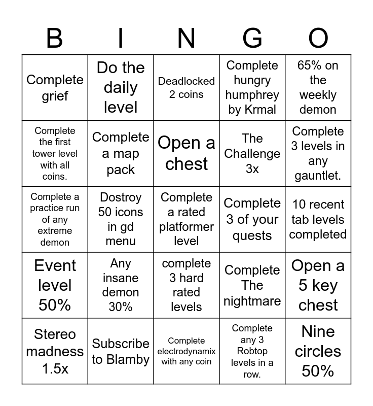 This bingo card has 25 words: Any insane demon 30%, Complete electrodynamix with any coin, Open a chest, Stereo madness 1.5x, 65% on the weekly demon, Complete grief, Complete the first tower level with all coins., Do the daily level, Complete 3 of your quests, complete 3 hard rated levels, The Challenge 3x, Complete a practice run of any extreme demon, Complete The nightmare, Open a 5 key chest, Complete a map pack, Nine circles 50%, 10 recent tab levels completed, Deadlocked 2 coins, Complete 3 levels in any gauntlet., Dostroy 50 icons in gd menu, Complete a rated platformer level, Subscribe to Blamby, Event level 50%, Complete hungry humphrey by Krmal and Complete any 3 Robtop levels in a row..
