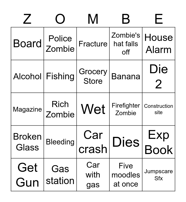 This bingo card has 25 words: Bleeding, Car with gas, Grocery Store, Get Gun, House Alarm, Board, Alcohol, Police Zombie, Firefighter Zombie, Car crash, Banana, Magazine, Dies, Exp Book, Fishing, Jumpscare Sfx, Construction site, Fracture, Die 2, Rich Zombie, Wet, Gas station, Broken Glass, Zombie's hat falls off and Five moodles at once.