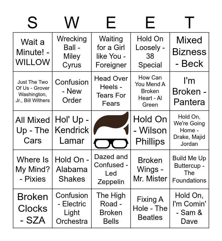 This bingo card has a free space and 40 words: All Mixed Up - 311, All Mixed Up - The Cars, Ball Of Confusion (That's What The World Is Today) - The Temptations, Confusion - New Order, Confusion - Electric Light Orchestra, Dazed and Confused - Led Zeppelin, Head Over Heels - Tears For Fears, I Can't Tell You Why - Eagles, Mixed Bizness - Beck, Where Is My Mind? - Pixies, Hol' Up - Kendrick Lamar, Hold On Loosely - 38 Special, Hold On, I'm Comin' - Sam & Dave, Hold On, We're Going Home - Drake, Majid Jordan, Hold On - Wilson Phillips, Hold On - Alabama Shakes, The Next Episode - Dr. Dre, Snoop Dogg, Wait a Minute! - WILLOW, Waitin' for a Superman - The Flaming Lips, Waiting for a Girl like You - Foreigner, Build Me Up Buttercup - The Foundations, Fixing A Hole - The Beatles, How Can You Mend A Broken Heart - Al Green, Just The Two Of Us - Grover Washington, Jr., Bill Withers, Lego Houser - Ed Sheeran, One Thing Leads To Another - The Fixx, Sexual Healing - Marvin Gaye, The Fixer - Pearl Jam, We Built This City - Starship, Break Stuff - Limp Bizkit, Break Ya Neck - Busta Rhymes, Broken Clocks - SZA, Broken Glass - Lorde, Broken Wings - Mr. Mister, I'm Broken - Pantera, The High Road - Broken Bells, Walking On Broken Glass - Annie Lennox, When The Levee Breaks - Led Zeppelin, Wrecking Ball - Miley Cyrus and Happy Together - The Turtles.