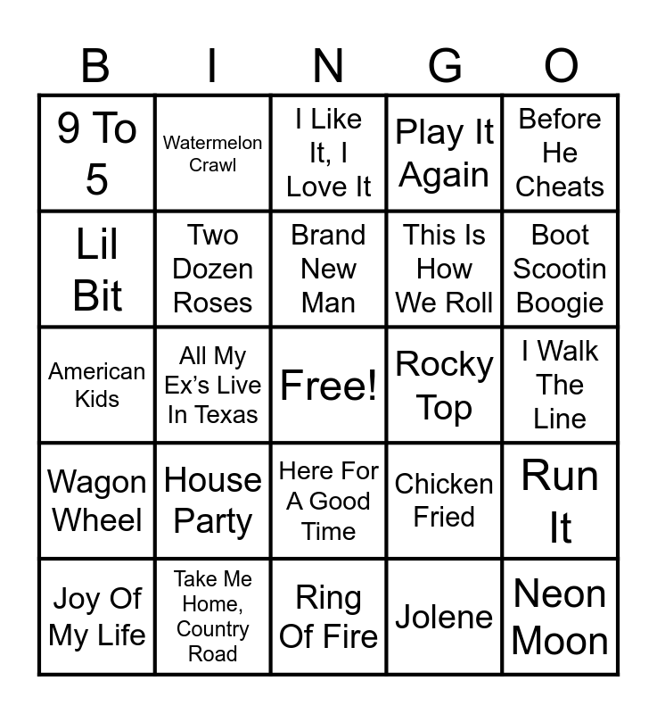 This bingo card has a free space and 30 words: Take Me Home, Country Road, Fishin In The Dark, All My Ex’s Live In Texas, The Devil Went Down To Georgia, 9 To 5, I Like It, I Love It, Two Dozen Roses, Here For A Good Time, Rocky Top, Ring Of Fire, I Walk The Line, Neon Moon, Jolene, The Gambler, Boot Scootin Boogie, Indian Outlaw, Chicken Fried, Wagon Wheel, House Party, Before He Cheats, American Kids, Pink Skies, Watermelon Crawl, This Is How We Roll, Lil Bit, Play It Again, Run It, Joy Of My Life, Brand New Man and Cruise.