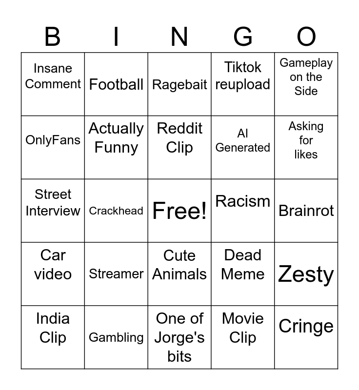 This bingo card has a free space and 24 words: Streamer, Gambling, Reddit Clip, India Clip, Gameplay on the Side, Insane Comment, OnlyFans, Football, Racism, Cute Animals, AI Generated, Street Interview, Dead Meme, Zesty, Actually Funny, Movie Clip, Brainrot, Ragebait, Asking for likes, Crackhead, Cringe, Car video, Tiktok reupload and One of Jorge's bits.