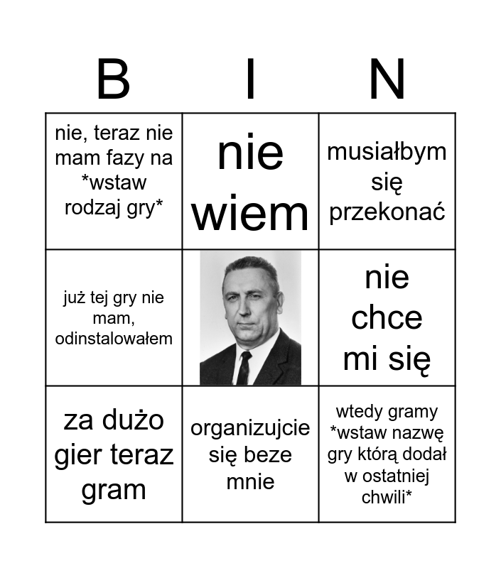This bingo card has a free space and 8 words: nie chce mi się, musiałbym się przekonać, nie wiem, za dużo gier teraz gram, nie, teraz nie mam fazy na *wstaw rodzaj gry*, wtedy gramy *wstaw nazwę gry którą dodał w ostatniej chwili*, już tej gry nie mam, odinstalowałem and organizujcie się beze mnie.