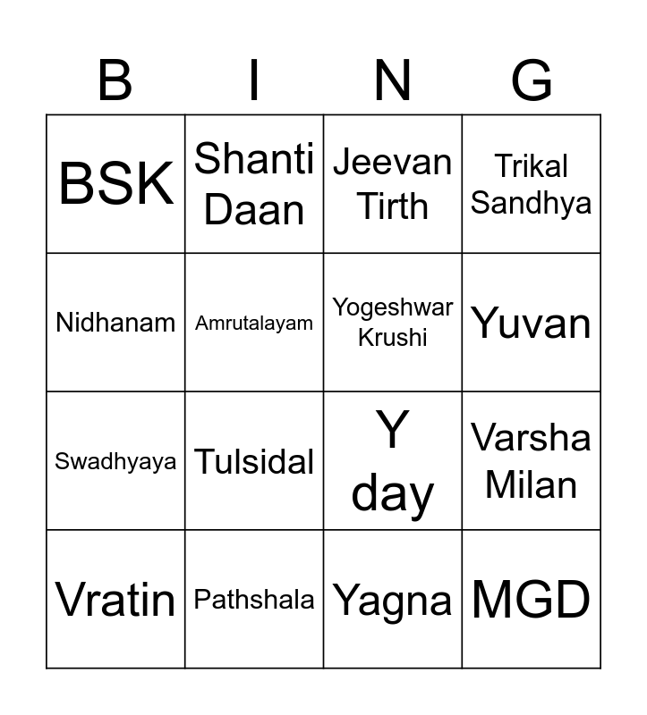 This bingo card has 35 words: Free!, Krutagnata, Asmita, Yogeshwar Krushi, Vruksh Mandir, Trikal Sandhya, Amrutalayam, Tejasvita, Yuvan, Madhav Vrund, Y day, Nidhanam, Bhavgeet, Bhaktipheri, BSK, Pathshala, TVP, Varsha Milan, MGD, Vratin, Kutumb Prahana, Shree Darshanam, Bhagvad Geeta, Rushi Smaran, Jeevan Tirth, Tulsidal, Bodh Vachan, Goras, Swadhyaya, Yagna, TeerthYatara, PanchRangi Kranti, Smruti Daan, Shanti Daan and Shakti Daan.