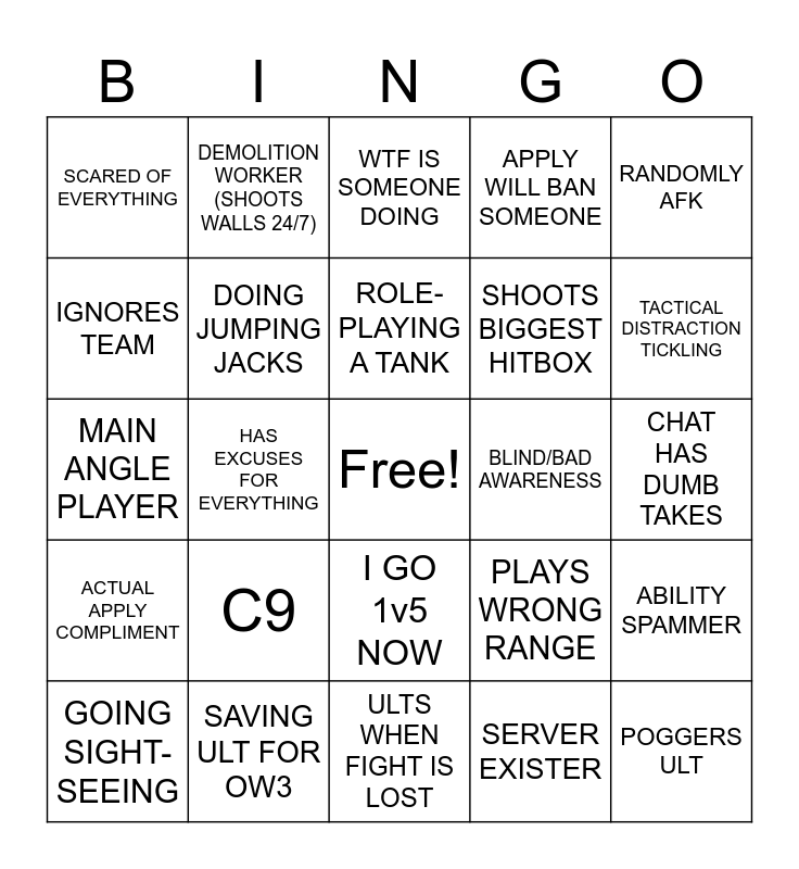 This bingo card has a free space and 24 words: C9, SAVING ULT FOR OW3, ROLE-PLAYING A TANK, GOING SIGHT-SEEING, RANDOMLY AFK, SCARED OF EVERYTHING, IGNORES TEAM, DEMOLITION WORKER (SHOOTS WALLS 24/7), BLIND/BAD AWARENESS, I GO 1v5 NOW, SHOOTS BIGGEST HITBOX, MAIN ANGLE PLAYER, PLAYS WRONG RANGE, ABILITY SPAMMER, DOING JUMPING JACKS, SERVER EXISTER, CHAT HAS DUMB TAKES, WTF IS SOMEONE DOING, TACTICAL DISTRACTION TICKLING, HAS EXCUSES FOR EVERYTHING, POGGERS ULT, ACTUAL APPLY COMPLIMENT, APPLY WILL BAN SOMEONE and ULTS WHEN FIGHT IS LOST.