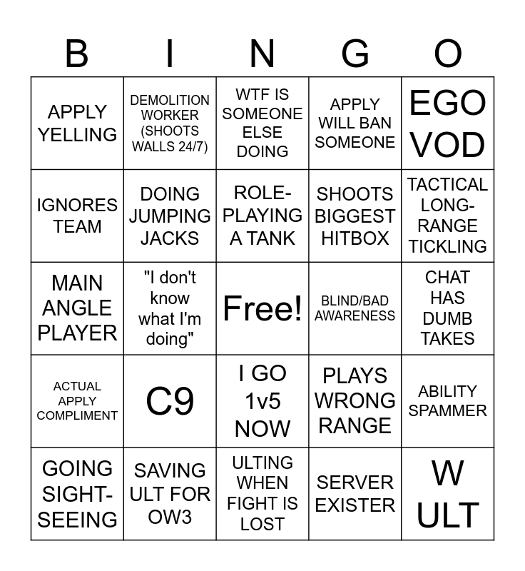 This bingo card has a free space and 24 words: C9, SAVING ULT FOR OW3, ROLE-PLAYING A TANK, GOING SIGHT-SEEING, EGO VOD, APPLY YELLING, IGNORES TEAM, DEMOLITION WORKER (SHOOTS WALLS 24/7), BLIND/BAD AWARENESS, I GO 1v5 NOW, SHOOTS BIGGEST HITBOX, MAIN ANGLE PLAYER, PLAYS WRONG RANGE, ABILITY SPAMMER, DOING JUMPING JACKS, SERVER EXISTER, CHAT HAS DUMB TAKES, WTF IS SOMEONE ELSE DOING, TACTICAL LONG-RANGE TICKLING, "I don't know what I'm doing", W ULT, ACTUAL APPLY COMPLIMENT, APPLY WILL BAN SOMEONE and ULTING WHEN FIGHT IS LOST.