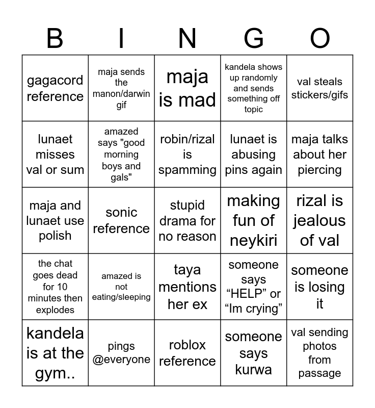 This bingo card has 35 words: rizal yapping about jazmin bean, robin sending a copypasta, robin is talking about matt, amazed says "good morning boys and gals", taya mentions her ex, kandela shows up randomly and sends something off topic, lunaet misses val or sum, someone sends gumball gifs, robin/rizal is spamming, lunaet sings young multi, maja and lunaet use polish, val steals stickers/gifs, Free!, taya talks about australia, gagacord reference, making fun of neykiri, someone says kurwa, sonic reference, the chat goes dead for 10 minutes then explodes, stupid drama for no reason, someone says “HELP” or “Im crying”, kandela is at the gym.., someone is losing it, pings @everyone, maja is mad, maja talks about her piercing, val sending photos from passage, robin talks about mgultra or machine girl in general, lunaet is abusing pins again, rizal is jealous of val, rizal sends her feet pics, roblox reference, amazed is not eating/sleeping, maja sends the manon/darwin gif and weird voice messages.