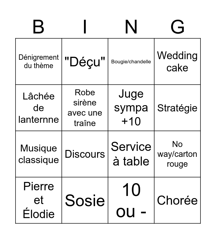 This bingo card has 16 words: Sosie, No way/carton rouge, Bougie/chandelle, Dénigrement du thème, Musique classique, "Déçu", Service à table, 10 ou -, Lâchée de lanternne, Robe sirène avec une traîne, Pierre et Élodie, Wedding cake, Discours, Stratégie, Juge sympa +10 and Chorée.