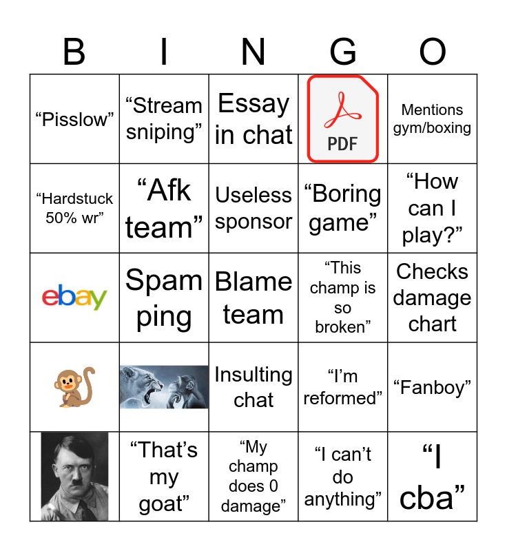 This bingo card has 4 images, a free space and 28 words: “I can’t do anything”, 💎🐷, Spam ping, “Get me out”, 🐒, “Afk team”, Mentions gym/boxing, “Fanboy”, “Stream sniping”, DuoQ abuser, Useless sponsor, Essay in chat, Vod review, Check op.gg, “This champ is so broken”, “You guys are all dogshit”, Insulting chat, “I’m reformed”, Mickey mouse voice, Checks damage chart, “That’s my goat”, “I cba”, “Boring game”, “Hardstuck 50% wr”, “Pisslow”, “My champ does 0 damage”, Reporting entire team and “How can I play?”.