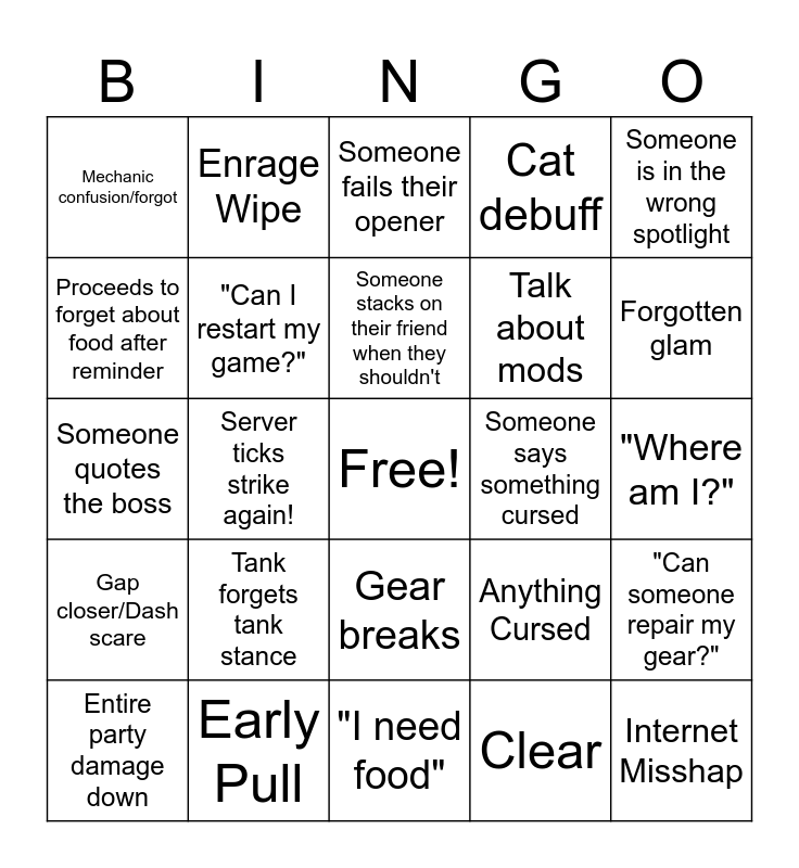 This bingo card has a free space and 37 words: DPS gets Tankbuster, Wipe on first mechanic, Horse/Boyfriend mentioned, "Can I restart my game?", "Can someone repair my gear?", Tank forgets tank stance, Someone stacks on their friend when they shouldn't, Group/Role Confusion, Someone is in the wrong spotlight, Someone gets cleaved, Server ticks strike again!, Cat debuff, Internet Misshap, "Where am I?", Proceeds to forget about food after reminder, Gap closer/Dash scare, Someone steps in the outside soup, Someone fails their opener, Gear breaks, Someone says something cursed, Mechanic confusion/forgot, Forgotten glam, Entire party damage down, "I need food", First pull clear, Clear, Enrage Wipe, "How do I play this game again?", Someone forgets their rotation, Rant about something random, Hates on random country for fun, Early Pull, Someone quotes the boss, Emote spam, Anything Cursed, Talk about mods and Brainrot.