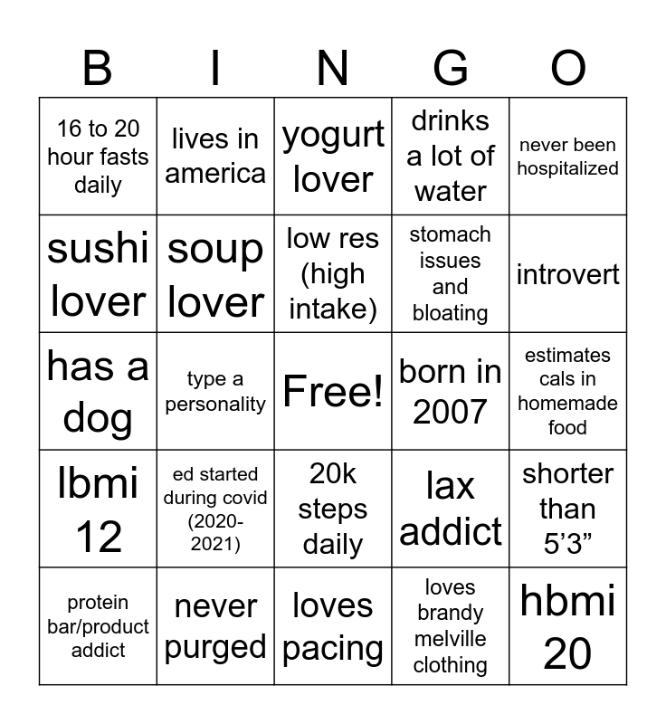 This bingo card has a free space and 24 words: ed started during covid (2020-2021), never purged, low res (high intake), protein bar/product addict, never been hospitalized, 16 to 20 hour fasts daily, sushi lover, lives in america, born in 2007, 20k steps daily, stomach issues and bloating, has a dog, lax addict, shorter than 5’3”, soup lover, loves brandy melville clothing, estimates cals in homemade food, yogurt lover, introvert, type a personality, hbmi 20, lbmi 12, drinks a lot of water and loves pacing.